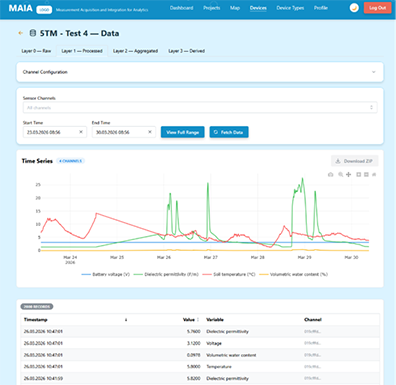 - Über eine moderne Web-Oberfläche und eine standardisierte Programmierschnittstelle (API) können Forschende ihre Sensordaten einsehen, visualisieren und für weitere Analysen herunterladen.