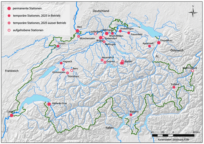 An ausgewählten Stationen an Schweizer Flüssen werden wöchentlich oder zweiwöchentlich abflussproportionale Proben genommen und kontinuierlich Daten zu Abfluss und In-situ-Messungen erhoben.