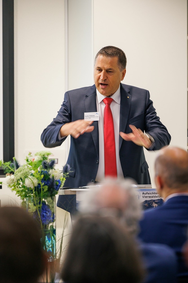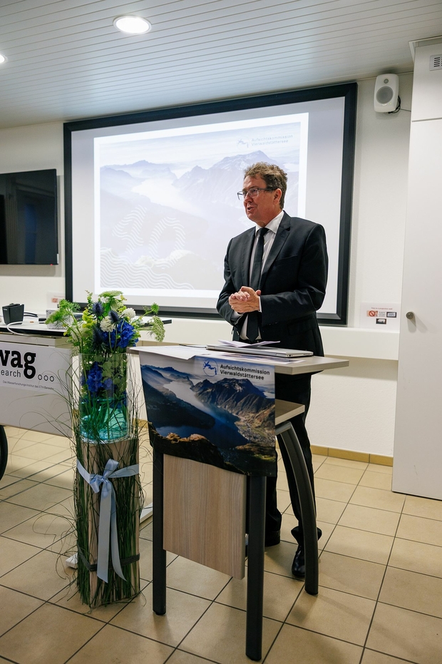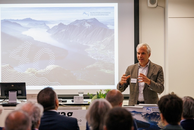 Zum Jubiläum sprachen Referenten über Vergangenheit, Gegenwart und Zukunft des Sees. Sandro Patierno, Landesstatthalter des Kantons Schwyz und Präsident der Aufsichtskommission, eröffnete den Anlass: «Lasst uns gemeinsam dafür sorgen, dass der Vierwaldstättersee und sein Einzugsgebiet auch für zukünftige Generationen als lebenswerter Naherholungsraum erhalten bleibt», hob der Präsident der AKV hervor. Dem stimmte auch Eawag Direktor Martin Ackermann zu: «Der Vierwaldstättersees liegt gratis da, ist aber unbezahlbar. Nur mit einer lebendigen Partnerschaft zwischen Forschung, Verwaltung und Politik können wir alle zu seinem nachhaltigen Schutz beitragen», sagte er. Mit Blick auf den aktuellen Spardruck fügte er noch an: «Probleme frühzeitig erkennen und darauf gestützt die richtigen Massnahmen zu treffen, ist bestimmt billiger als Schäden im Nachhinein zu reparieren – falls das überhaupt möglich ist.»