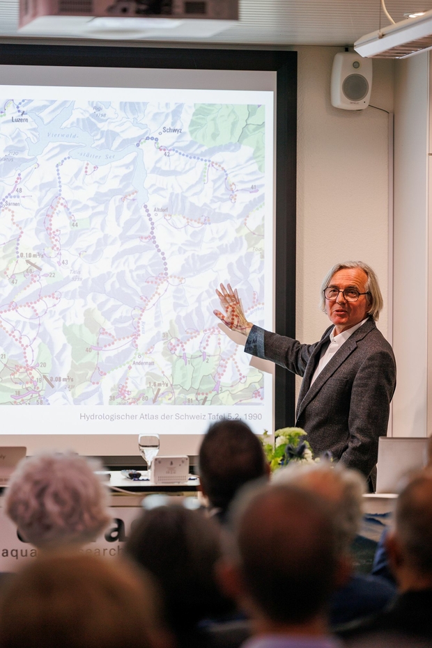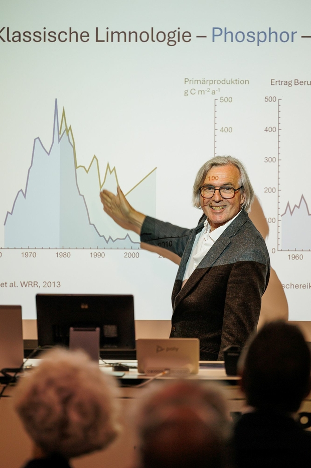 Bernard Wehrli, über 30 Jahre aktiv an der Eawag und nun emeritierter Professor der ETH Zürich, blickte zurück auf zentrale wissenschaftliche und gesellschaftliche Debatten, etwa zum Phosphormanagement, zur Fisch-Diversität, zur Renaturierung von Ufern und Zuflüssen – «hier gibt es noch zu tun» – sowie zum Umgang mit «guten und schlechten» Tieren und Pflanzen im Vierwaldstättersee.