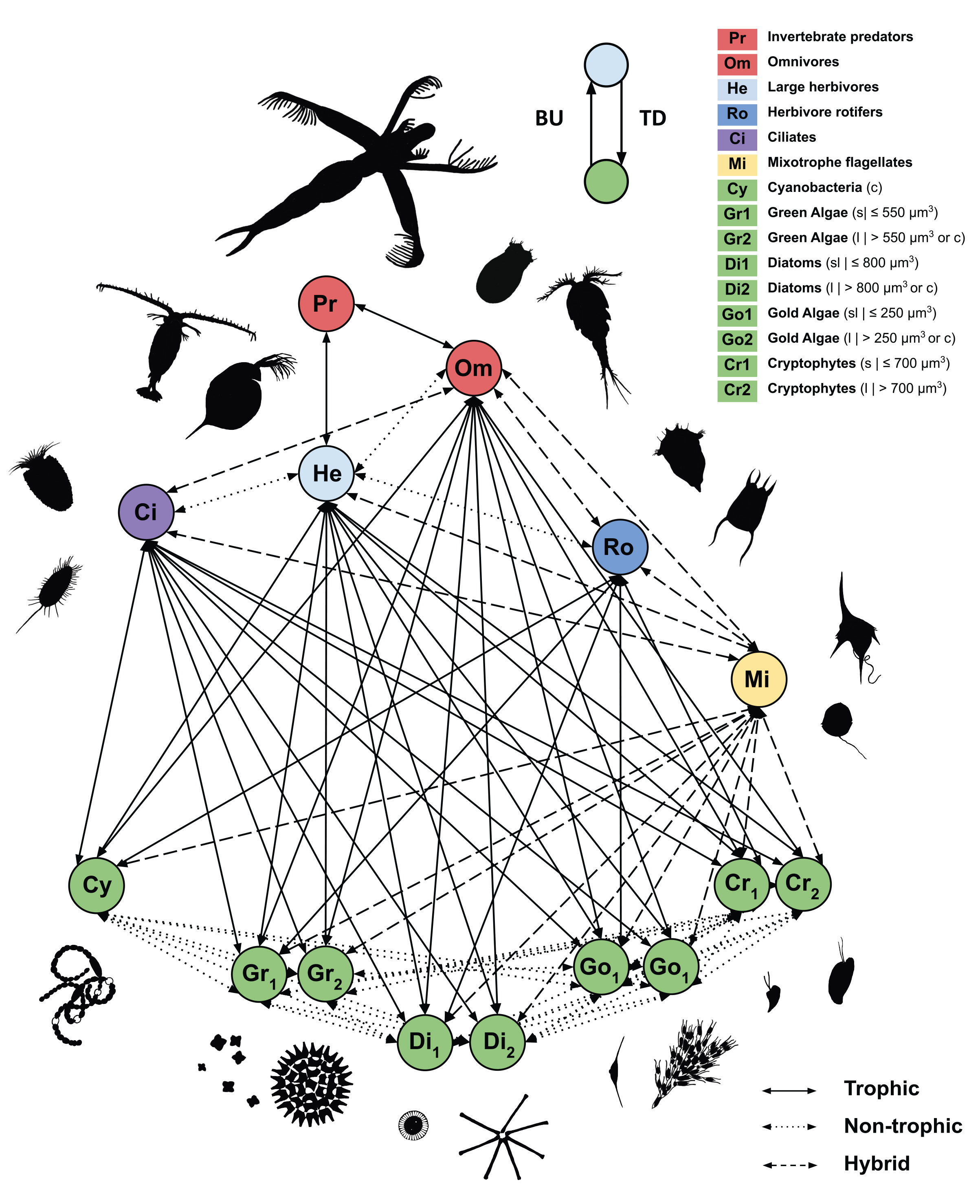 Modell eines Planktonnetzwerks: Zooplankton (oben) und Phytoplankton (unten) interagieren auf vielfältige Weise. Trophische Interaktionen beziehen sich auf das Nahrungsnetz; nicht-trophische Interaktionen umfassen Wettbewerb und Förderung. Hybride Interaktionen können beides sein. Trophische und hybride Interaktionen gehen von oben nach unten (top-down, TD) oder von unten nach oben (bottum-up, BU).