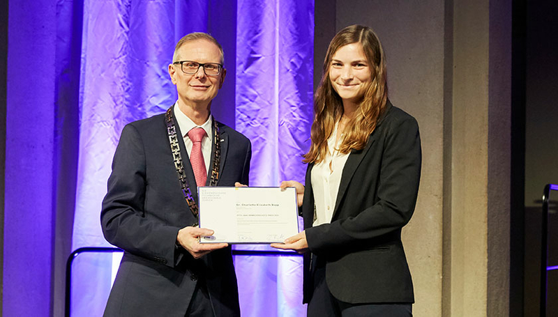 Titelbild: ETH-Rektor Günther Dissertori überreicht Charlotte Bopp den Otto-Jaag-Gewässerschutzpreis 2023 (Foto: ETH, Giulia Marthaler)
