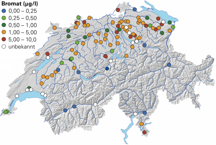 Um Mikroverunreinigungen aus dem Abwasser zu entfernen, stattet die Schweiz in den kommenden Jahren rund hundert Kläranlagen mit einer zusätzlichen Reinigungsstufe aus. Das Verfahren der Wahl ist oft die Behandlung mit Ozon. Ist das Abwasser stark mit Bromid verschmutzt, entsteht bei der Ozonung aber potenziell krebserregendes Bromat, das mit dem geklärten Abwasser in Flüsse und Seen gelangt. Betroffen sind vor allem Kläranlagen, in deren Einzugsgebiet sich Chemiebetriebe und Kehrrichtverbrennungsanlagen befinden. Heute weisen die Schweizer Gewässer normalerweise Bromatkonzentrationen unter der Nachweisgrenze von 0,25 Mikrogramm pro Liter (μg/l) auf. Der Toleranzwert der Fremd- und Inhaltsstoffverordnung für Trinkwasser liegt bei 10 μg/l. Mit Modellrechnungen haben Wissenschaftler der Eawag nun gezeigt, dass die Konzentrationen in den grossen Flüssen nach dem ARA-Ausbau selbst im schlimmsten Fall nur wenig ansteigen. Für den Rhein bei Basel ermittelten sie eine Belastungszunahme von 0,35 μg/l, für die Rhone bei Genf 0,27 μg/l. Bei kleineren Gewässern kann es dagegen zu Belastungen kommen, die eine Trinkwassernutzung erschweren. In jedem Fall gelte es, so die Forscher, die Bromatbildung sorgfältig abzuklären und wenn nötig statt auf eine Ozonung auf eine Elimination mit Aktivkohle zu setzen.