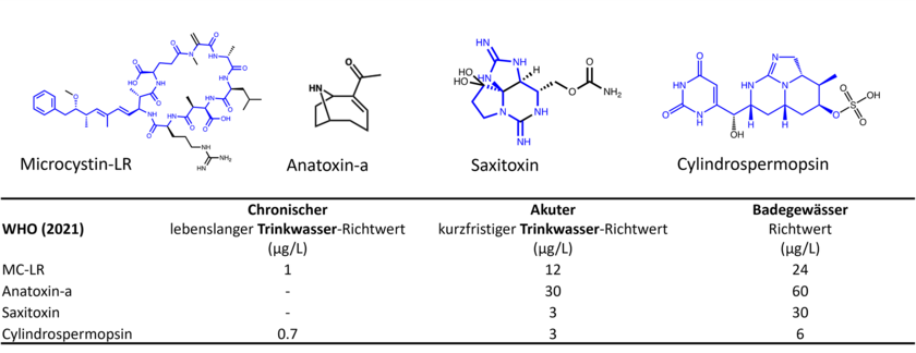 Seit 2021 sind insgesamt vier Substanzen, die ausreichend untersucht sind, in die WHO-Richtlinien als Giftstoffe aufgeführt: Microcystin-LR, hepatotoxisch; Saxitoxin und Anatoxin-a, beide neurotoxisch; sowie das zytotoxische Cylindrospermopsin.
