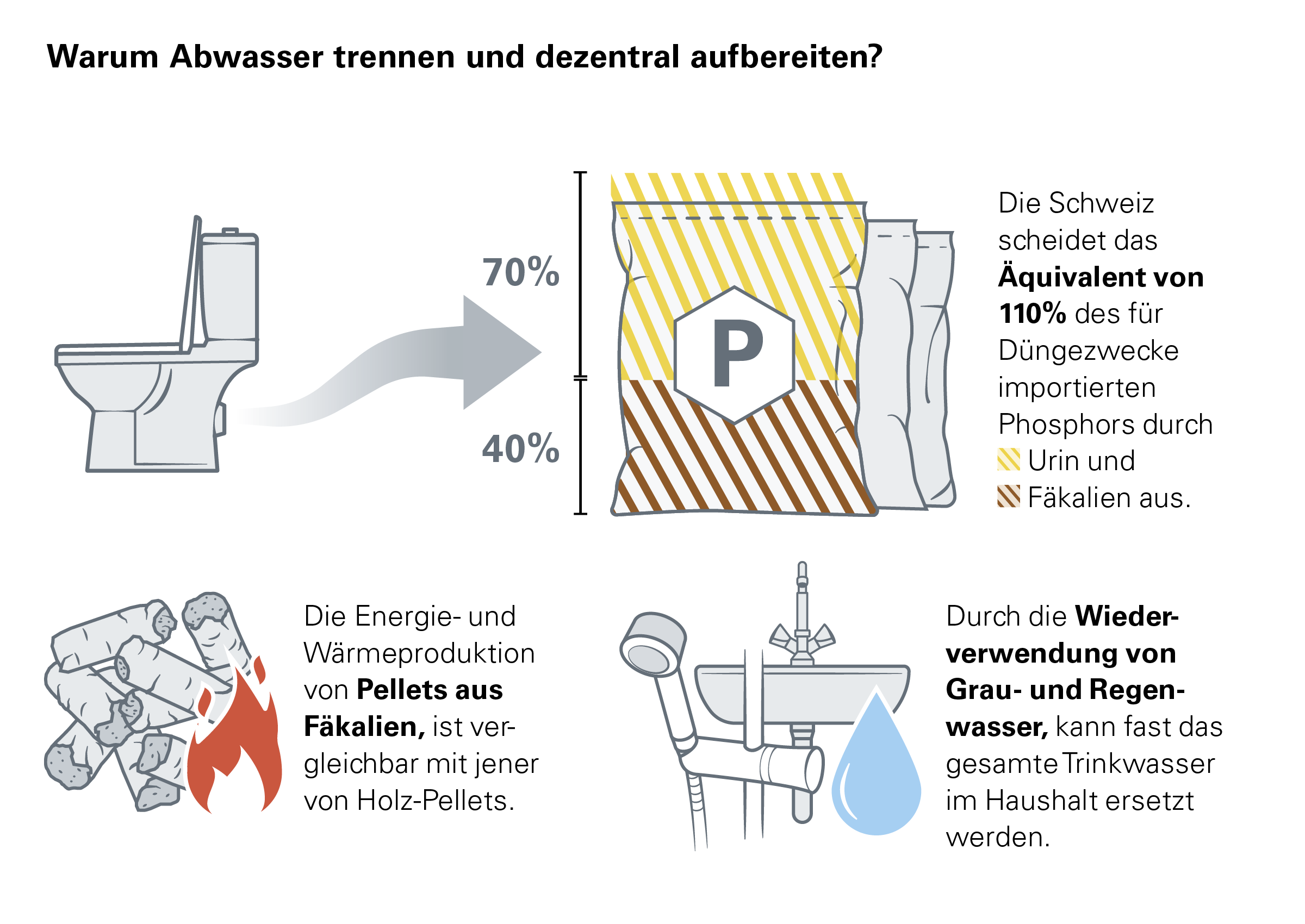 Aus dem nur leicht verschmutzten Grauwasser, das beim Duschen, Waschen oder Abwaschen anfällt, kann man mit unterschiedlichen Methoden vor Ort sauberes Wasser rückgewinnen. Dieses Wasser kann je nach Qualität lokal im Gebäude bzw. im Quartier für die Toilettenspülung, zum Duschen oder zur Bewässerung verwendet werden. Dabei ist es wichtig, dass die Prozesse robust sind und die Hygiene jederzeit sichergestellt ist.
