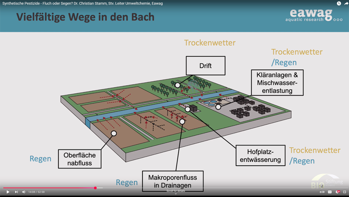 Pestizid ist eine Sammelbezeichnung biologisch aktive Wirkstoffe, mit denen unerwünschte Organismen bekämpft werden. In der Landwirtschaft, auch im Gartenbau, werden sie gegen Unkraut (Herbizide), Pilze (Fungizide) und Insekten (Insektizide) eingesetzt. In Haushalten oder zum Beispiel in Baumaterialien, Farben oder Putzen spricht man eher von Bioziden. Viele Wirkstoffe gelangen irgendwann auch ins Wasser. Sie können Trinkwasserressourcen gefährden oder Gewässerorganismen schädigen.