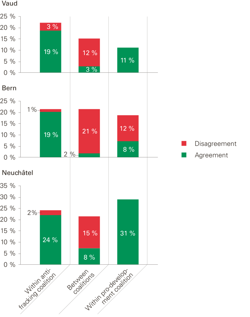 Fig. 4: Average values for agreement (green) and disagreement (red) within and between coalitions. The values are to be interpreted as follows: within the anti-fracking coalition in Canton Neuchâtel, for example, the level of agreement is 24 per cent, and disagreement 2 per cent; 100 per cent agreement would be reached if all actors stated that their policy positions coincided with those of all other actors within the coalition.