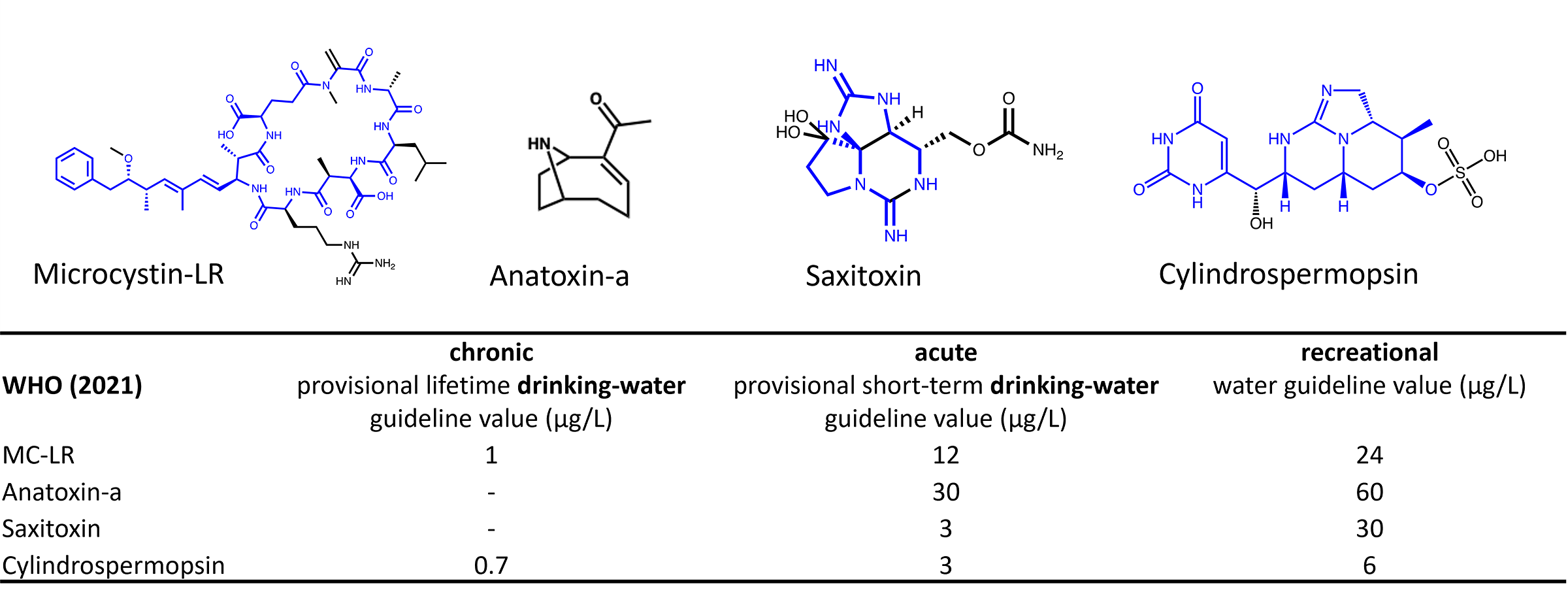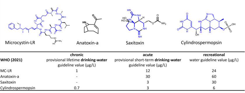 Since 2021, a total of four substances that have been sufficiently studied are listed as toxins in the WHO guidelines: microcystin-LR, which is hepatotoxic; saxitoxin and anatoxin-a, both of which are neurotoxic; and the cytotoxic cylindrospermopsin.