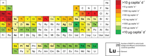 It is interesting to note the per capita fluxes calculated for the Swiss population on the basis of the element concentrations measured. These range from a few micrograms (e.g. gold, indium, lutetium), or more than a milligram (e.g. zinc, scandium, yttrium, niobium, gadolinium), to more than a gram per day (e.g. phosphorus, iron, sulphur). While this may not seem much at first glance, the nationwide fluxes expressed in kilograms per year are quite substantial – 3000 kg of silver, 43 kg of gold, 1070 kg of gadolinium, 1500 kg of neodymium and 150 kg of ytterbium (see Table S9 in the original publication).