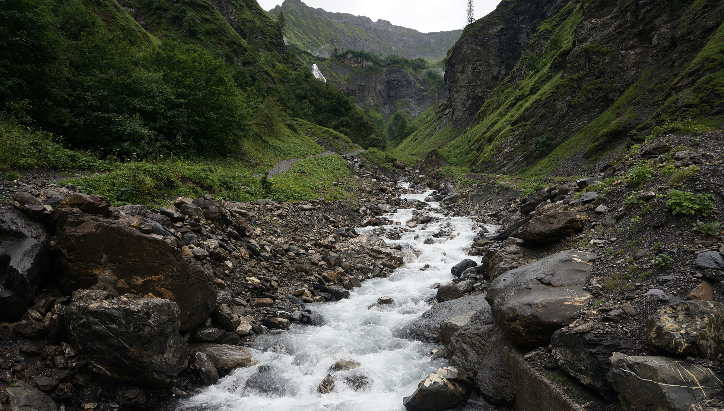 Le Gufelbach dans la vallée de Weisstannen (SG) avant et après le détournement pour l'exploitation hydroélectrique. (Eawag, Andri Bryner)