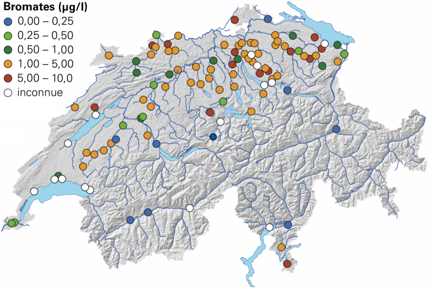 Dans les années qui viennent, la Suisse équipera une centaine de stations d'épuration d'une étape supplémentaire pour l'élimination des micropolluants contenus dans les eaux usées. La technique choisie est alors souvent l'ozonation. Si les effluents sont riches en bromures, ce processus d'oxydation peut cependant produire des bromates potentiellement cancérigènes qui peuvent alors se déverser dans les lacs et rivières avec les eaux traitées. Ce problème peut surtout concerner les stations d'épuration dont le bassin versant comporte des sites d'industrie chimique ou des usines d'incinération des ordures ménagères. Les teneurs en bromates aujourd'hui mesurées dans les eaux suisses se situent normalement en dessous de la limite de détection de 0,25 microgrammes par litre (µg/l). La valeur de tolérance fixée pour l'eau potable dans l'ordonnance sur les substances étrangères et les composants est de 10 µg/l. Des chercheurs de l'Eawag viennent maintenant de montrer dans une modélisation que, même dans le pire des cas, les concentrations ne devraient augmenter que très faiblement dans les fleuves et grandes rivières après l'installation de l'ozonation. L'augmentation serait ainsi de 0,35 µg/l dans le Rhin à Bâle et de 0,27 µg/l dans le Rhône à Genève. Dans les petits cours d'eau, en revanche, les charges en bromates pourraient éventuellement atteindre des niveaux compromettant une utilisation pour l'eau potable. Les chercheurs recommandent ainsi d'examiner la situation avec soin avant d'envisager une ozonation et, en cas de risque, d'opter pour un traitement au charbon actif.