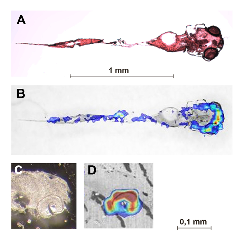 A) Photo d'optique après coloration des tissus, B) Surimposition de A et des images de MALDI MSI. C) et D) Coupes sagittales de la tête avec l'œil en bas à droite ; bleu = faibles teneurs en cocaïne ; jaune-rouge = fortes teneurs en cocaïne.
