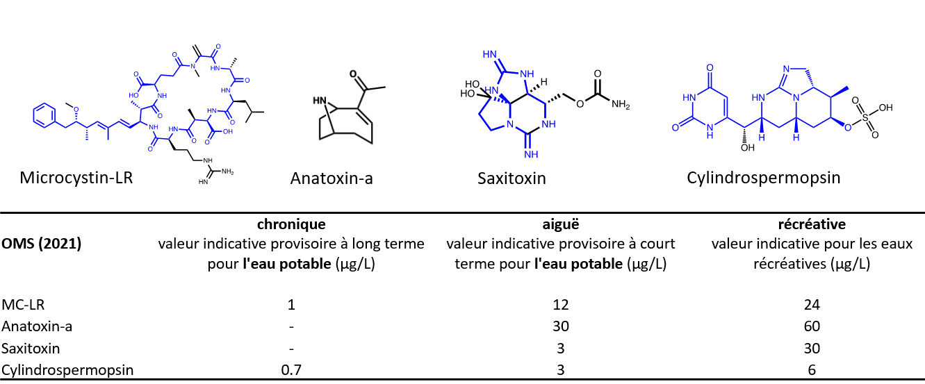 Depuis 2021, quatre substances ayant fait l'objet d'études suffisantes sont répertoriées comme toxiques dans les directives de l'OMS : la microcystine-LR, hépatotoxique ; la saxitoxine et l'anatoxine-a, toutes deux neurotoxiques ; ainsi que la cylindrospermopsine, cytotoxique.