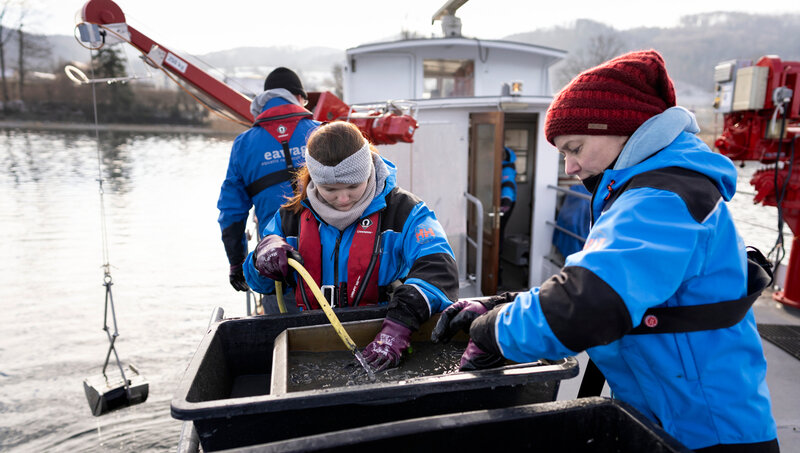 Titelbild: Die invasive Quagga-Muschel breitet sich rasant in den Schweizer Seen aus. Sie schädigt Ökosysteme und Infrastrukturanlagen und verursacht hohe Kosten. Forschende der Eawag untersuchen ihre Populationen, um Konzepte zur Überwachung und Prävention zu entwickeln. Mit einem Sedimentgreifer entnehmen sie Proben vom Seegrund und waschen diese in einem Sieb aus (siehe Bild). Die darin verbleibenden Muschelschalen werden dann im Labor gezählt und vermessen. (Foto: Eawag, Alessandro Della Bella)
